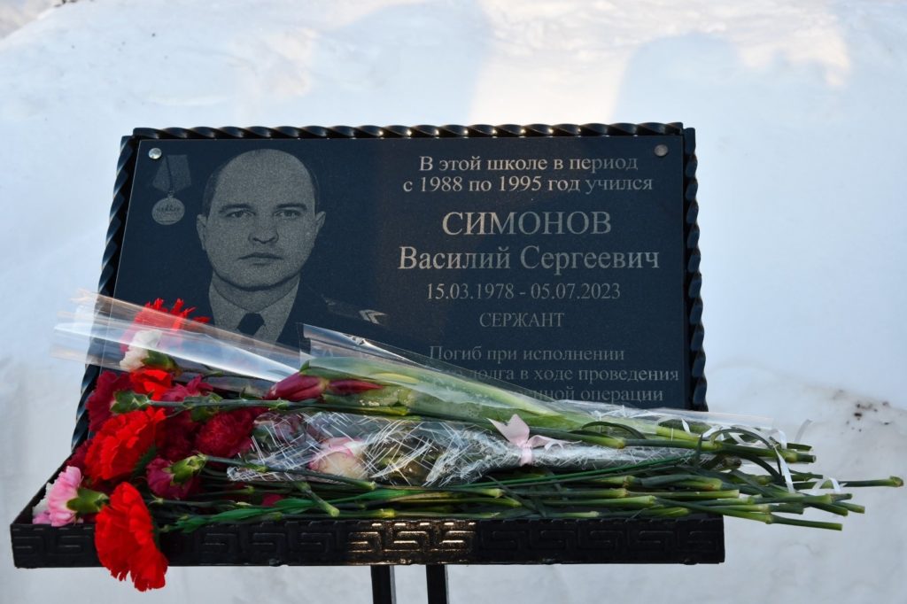 Мемориальная доска была установлена на территории Зареченской классической гимназии, где Василий Симонов учился с 1988 по 1995 годы.