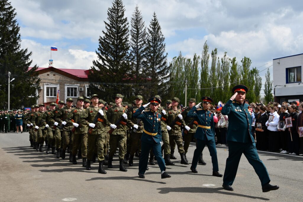 Под звуки военного оркестра торжественным маршем прошли колонны военнослужащих, кадетов, юнармейцев.