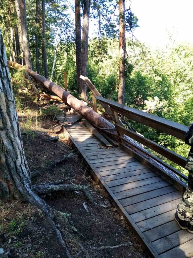 На смотровой площадке «Паникинский яр» шквалистый ветер уничтожил настил с ограждением, на тропе «Перекаты» ограда также пострадала от непогоды.