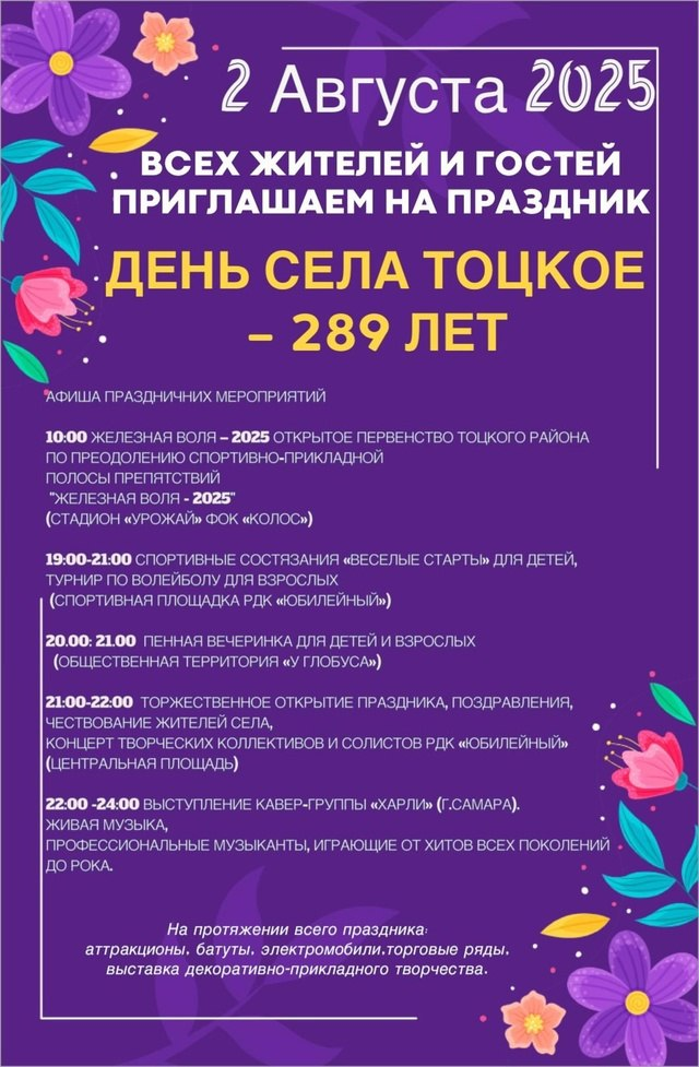 2 августа 2025 года Тоцкий район Оренбургской области отметит своё 289‑летие. Жителей и гостей приглашают на яркое и масштабное событие.